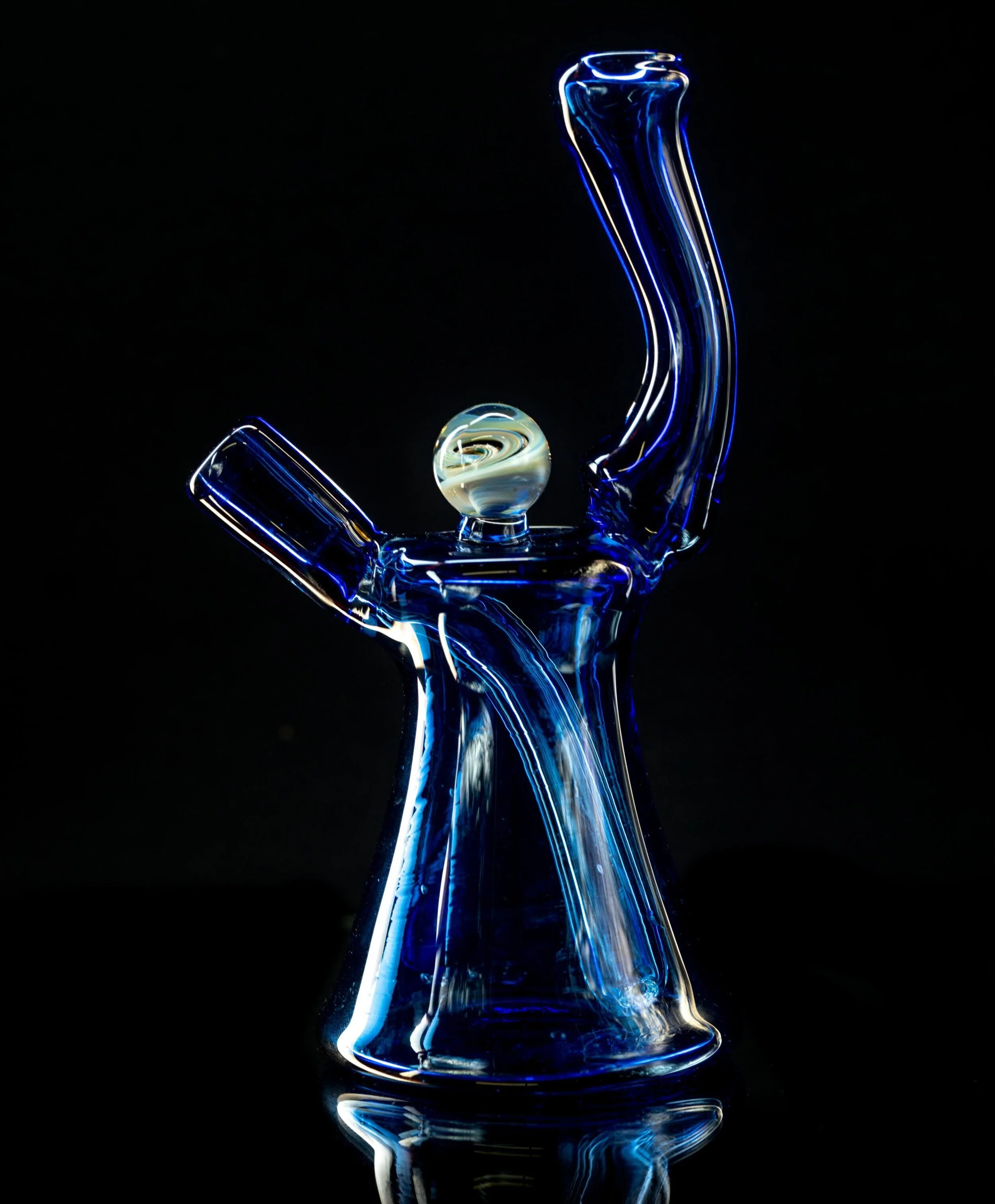Blue transparent jammer with encased vortex marble on top, 3 holes fixed downstem.